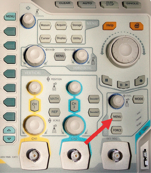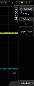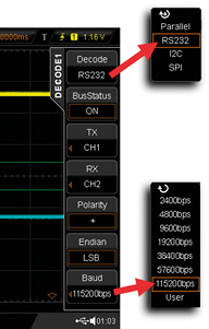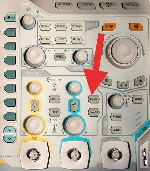Fotografia 3. Lokalizacja przycisku Decode1 na płycie czołowej oscyloskopu DS2202 Nasz analizator protokołów będzie wykorzystywał oba kanały oscyloskopu, które dołączymy do linii TxD i RxD. De facto będziemy mierzyć interfejs UART z 3,3-woltową logiką. Pomiar rozpoczynamy od włączenia funkcji analizatora protokołów (przycisk Decode1 (fotografia 3), – zauważmy, że możliwa jest niezależna analiza dwóch urządzeń). Na ekranie zostaje wyświetlone menu „DECODE1”, w którym z łatwością odnajdujemy pola, odpowiadające parametrom transmisji (rysunek 4). Idąc od góry są to: