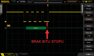 Zastosowanie opcji Error powoduje wyzwalanie oscyloskopu po wykryciu błędu ramki, czyli braku bitu stopu. Sytuację taką przedstawiono na rysunku 10. Jednocześnie czerwony znacznik wyświetlony na ekranie sygnalizuje miejsce, w którym wystąpił błąd. Na oscylogramie widzimy, że tam gdzie powinien być znak stopu o wartości „1”, jest „0”. Analogicznie działa opcja CheckError. Jest ona jednak stosowana tylko wtedy, gdy transmisja przebiega z włączoną kontrolą parzystości. Należy pamiętać o odpowiednim ustawieniu parametrów pracy analizatora protokołów. Zakończyliśmy konfigurowanie naszego oscyloskopu do pracy jako analizatora protokołu RS-232. Możemy przystąpić do pomiarów, ale o tym już w następnym odcinku. Jarosław Doliński, EP ![]() |