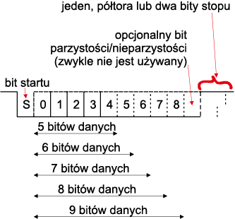 Teraz już na pewno możemy rozpocząć pomiary. Ramkę protokołu RS-232 przedstawiono na rysunku 2. Jak widać, mamy do czynienia z transmisją asynchroniczną, w której każdy wysyłany znak rozpoczyna się bitem startu. Następnie wysyłane są bity danych. Protokół przewiduje ramkę z 5, 6, 7, 8 lub 9 bitami. Najczęściej stosowana jest ramka 8-bitowa. W protokole przewidziano bit parzystości/nieparzystości, który jest wysyłany po bitach danych. Najczęściej jednak urządzenia z niego nie korzystają, w ramce po prostu go nie ma. Obowiązkowo natomiast muszą być wysłane bity stopu. Może być 1 bit, półtora bitu lub 2 bity. Zwykle korzystamy z jednego bitu stopu. Zaraz po zakończeniu wysyłania znaku (jego ostatniego bitu stopu) można rozpocząć wysyłanie następnego znaku. W nadajniku i w odbiorniku muszą być zastosowane wewnętrzne generatory taktujące o jednakowej częstotliwości. Ewentualna rozbieżność (w pewnym dopuszczalnym zakresie) jest niwelowana przez dosynchronizowanie się odbiornika na bitach startu. Warunkiem jest jednak prawidłowe rozpoznanie pierwszego bitu w transmisji, gdyż później bity startu niczym nie różnią się od pozostałych bitów i może nastąpić zerwanie komunikacji. Ważnym parametrem takiej komunikacji jest prędkość transmisji. Musi jej przestrzegać zarówno nadajnik, jak i odbiornik. Każde urządzenie dysponuje nadajnikiem (linia TxD) i odbiornikiem (linia RxD), co umożliwia transmisję dwukierunkową, więc obie linie muszą być skrzyżowane: TxD urządzenia 1 na RxD urządzenia 2 i analogicznie linie RxD na TxD. Powyższe informacje są wystarczające do odpowiedniego skonfigurowania obu urządzeń, będą też potrzebne do wprowadzenia prawidłowych nastaw analizatora protokołu. Przyjmijmy więc, że nasza ramka jest typu 115200,8,n,1, co oznacza, że dane są wysyłane z szybkością 115200 bitów na sekundę (to nie jest szybkość przesyłania znaków!), dana ma długość 8 bitów, nie korzystamy z bitu parzystości (gdyby taki bit był zastosowany zamiast „n” byłaby literka „o” – dla nieparzystości lub „e” – dla parzystości). Bit parzystości był wykorzystywany do kontroli prawidłowości transmisji, bardzo zawodnej zresztą. Specjalizowane układy odbiorników miały zainstalowany sprzętowy układ zliczający modulo 2 jedynki w przesyłanym znaku. Jeśli tak otrzymany wynik nie zgadzał się z bitem parzystości, ustawiana była odpowiednia flaga błędu, mogło być również generowane przerwanie. Dzisiaj opcja ta jest w zasadzie już tylko historyczną pozostałością i nikt z niej nie korzysta.