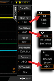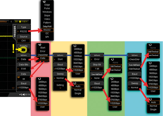 Po wykonaniu wszystkich czynności, na ekranie powinien pojawić się oscylogram zawierający przebiegi na liniach TxD i RxD wraz ze zdekodowanymi danymi. Przebiegi będą jednak prawdopodobnie dość przypadkowo przesuwały się poziomo po ekranie, gdyż nie wprowadziliśmy jeszcze odpowiedniego warunku wyzwalającego. Procedura jest bardzo podobna jak podczas ustawianiu parametrów transmisji, z tym że teraz należy wybrać menu ukryte pod przyciskiem Menu w sekcji wyzwalania (fotografia 7, rysunek 8). Widzimy znajome opcje, którym powinny być nadane wartości zgodne z wprowadzonymi wcześniej parametrami. Jest jednak pewien niejasny wyjątek. Otóż w przypadku opcji Polarity definiowanej w menu warunku wyzwalania, trzeba wprowadzić wartość „–” (poprzednio był +). Prawdopodobnie jest to jakiś błąd w oprogramowaniu oscyloskopu DS2202. W omawianym menu pojawiła się dodatkowa pozycja: