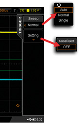 Rysunek 8. Menu TRIGGER zawierające opcje wyzwalania (pierwsza strona) Przydatnym warunkiem wyzwalania jest natomiast ustawianie pułapki na określoną daną. W ten sposób łatwo można sprawdzać, czy dana taka pojawia się w ogóle w transmisji. Poszukiwana dana jest wprowadzania w postaci dziesiętnej w dolnym polu Data menu wyzwalania. Niestety, w oscyloskopie DS2202 przewidziano tylko taką postać danej, jeśli poszukujemy na przykład znaku ASCII „R”, to należy dokonać ręcznego przeliczenia, korzystając z tablicy kodów ASCII. W naszym przypadku znak „R” ma wartość dziesiętną 82, i taką liczbę należy wprowadzić, korzystając z pokrętła wielofunkcyjnego. Wybierając taki warunek wyzwalania, szczególnie wtedy, gdy poszukujemy specyficznego, rzadko występującego w transmisji zdarzenia, korzystne jest włączenie trybu wyzwalania „Normal”. Opcja ta jest dostępna po przejściu do kolejnego okna menu wyzwalania (rysunek 9). W trybie „Normal” wychwycone zdarzenie zostaje stabilnie zatrzaśnięte na ekranie. Wprawdzie w trybie „Auto” następowałoby także wyzwalanie na określonym zdarzeniu, ale przy dłuższym braku kolejnego takiego zdarzenia oscyloskop byłby wyzwalany bez spełnienia warunku, skutkujące zerwaniem synchronizacji.