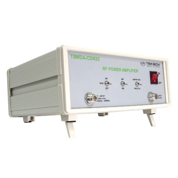 Wzmacniacz modulowany TBMDA-CDN25 zapewnia niezbędną moc, szerokość pasma i modulację do badań odporności przewodzonej przy użyciu sond CDN i BCI w zakresie częstotliwości od 100 kHz do 250 MHz. Jest on przeznaczony do wysterowania przez generatory sygnałowe lub przez generatory śledzące analizatorów widma. Z punktem kompresji 1 dB do 25 W w zakresie częstotliwości od 100 kHz do 250 MHz może generować poziomy testowe klasy 1, klasy 2, klasy 3 i klasy X zgodnie z ISO / EN 61000-4-6. Wbudowany modulator AM / PM - umożliwia wykorzystanie generatorów śledzących jako źródła sygnału. TBMDA-CDN25 ma wystarczające wzmocnienie, aby osiągnąć maksymalną moc wyjściową przy 0 dBm dostarczanym przez generator śledzący analizatora widma.