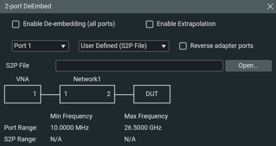 Operacja de-embed przywołuje plik „*.S2P” w formacie Touchstone. Plik ten zawiera charakterystykę elektryczną 2-portowego urządzenia lub komponentu, taką jak impedancja i faza. Analizując i obliczając dane zawarte w tym pliku w połączeniu z danymi pomiarowymi, funkcja de-embed może wyeliminować wpływ urządzenia na wyniki pomiarów.