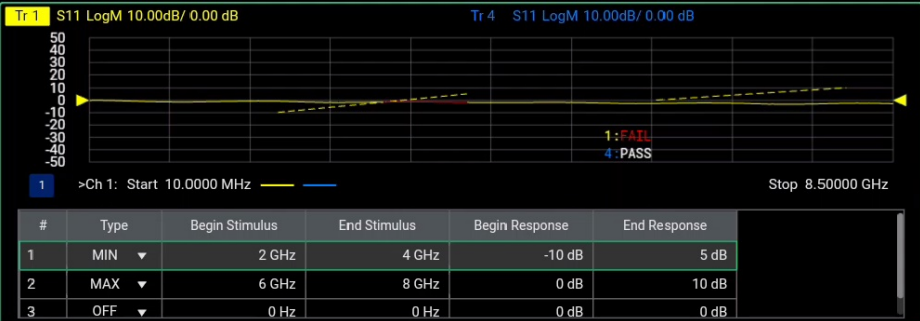 Test graniczny porównuje zmierzone dane z określoną wartością graniczną w celu oceny, czy dane odpowiedzi pomiaru spełniają warunki PASS/FAIL, aby uzyskać wynik testu.