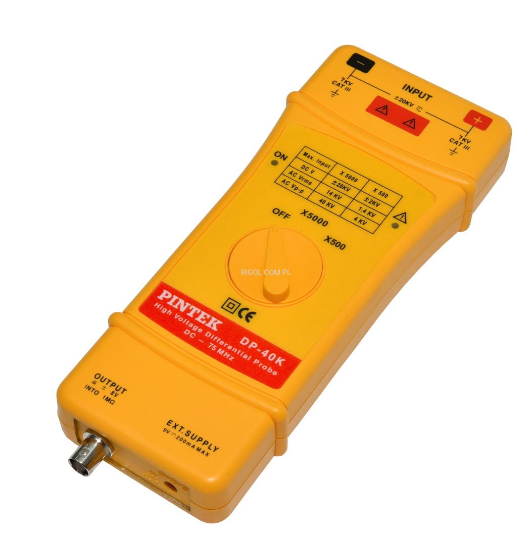 Wysokonapięciowa sonda różnicowa DP-40K firmy Pintek. Pasmo: DC~75 MHz (500:1), DC~20 MHz (5000:1). Napięcie różnicowe DC + szczytowe AC: maks. 20 kV DC lub 40 kVp-p lub AC 14 KV / 60 Hz